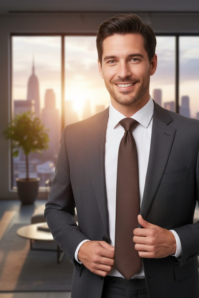 Elegancki brązowy krawat o klasycznej szerokości 7 cm, który jest idealnym wyborem dla mężczyzn, którzy chcą wyglądać stylowo. Krawat wykonany jest z wysokiej jakości poliestru, co zapewnia jego trwałość i odporność na zagniecenia.
