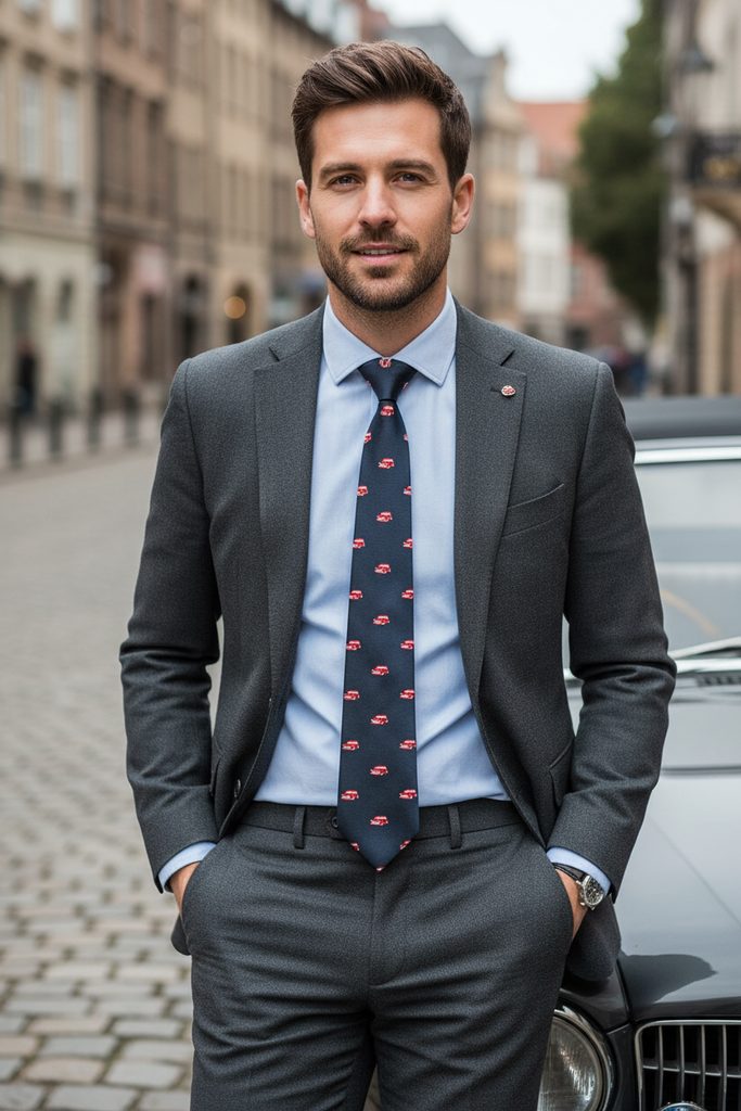 Krawat męski w ciemnoniebieskim odcieniu z czerwonymi samochodami to zabawny dodatek dla każdego zapalonego kierowcy. Jednocześnie tym krawatem zrobisz wrażenie przy każdej okazji. Krawat ma szerokość 8 cm i wykonany jest z wysokiej jakości poliestru.