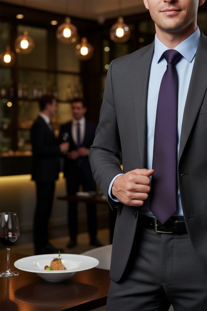 Ciemnofioletowy krawat o delikatnej strukturze powierzchni wykonany jest z poliestru i ma szerokość 7 cm. Elegancki i gustowny krawat męski doskonale sprawdzi się na wszelkie uroczyste okazje.