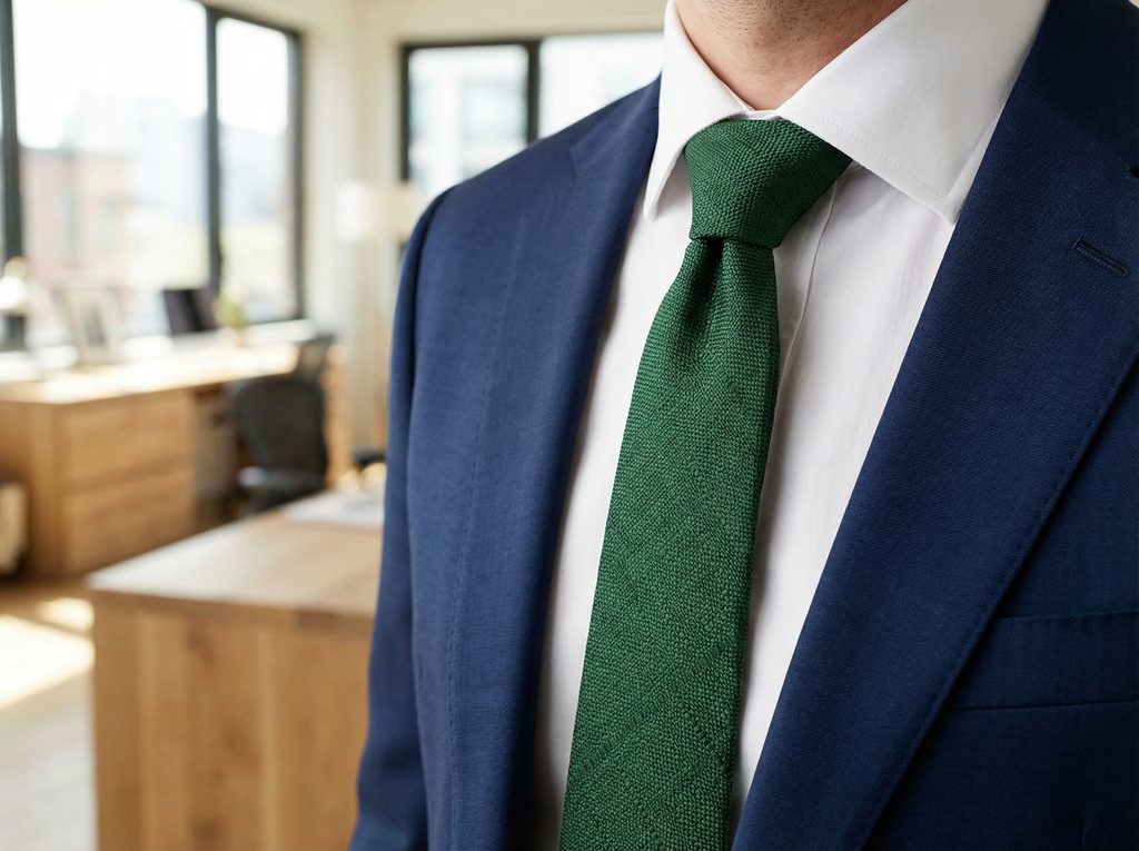 Ciemnozielony krawat najlepiej prezentuje się z białą koszulą, gdzie jego kolor jest najbardziej wyrazisty, ale dobrze komponuje się także z jasnoniebieską koszulą dla łagodniejszego efektu. W zestawieniu z granatowym garniturem lub szarą marynarką tworzy spójną całość, natomiast beżowa marynarka nadaje stylizacji bardziej swobodny charakter. Całość można uzupełnić o poszetkę w prostym wydaniu lub dopasowaną tonalnie oraz szelki, które podkreślą styl.