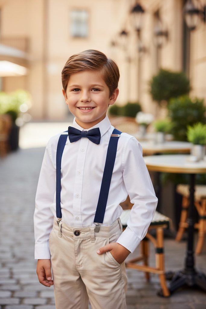 Te dziecięce szelki są przeznaczone dla naszych małych eleganckich. Ciemnoniebieskie szelki dla chłopca, czarna skóra i klipsy metalowe mają na końcach elastyczne paski z metalowymi klipsami, dzięki czemu można je łatwo przymocować do spodni.