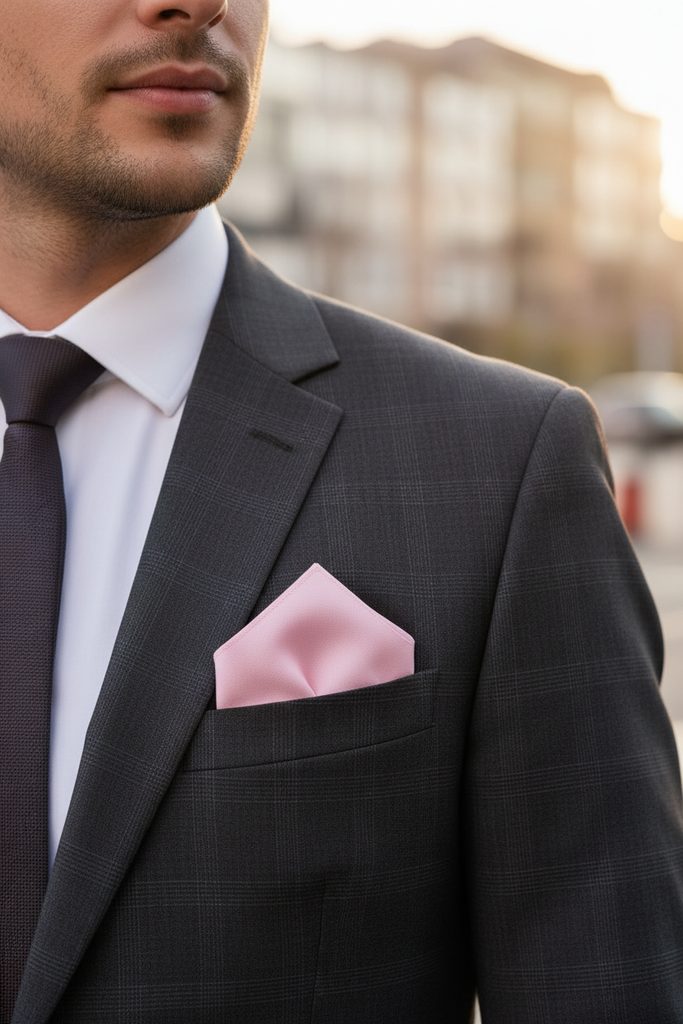 Elegancki dodatek do kieszeni marynarki. Delikatna różowa poszetka dla mężczyzn ma rozmiar 28x28 cm.