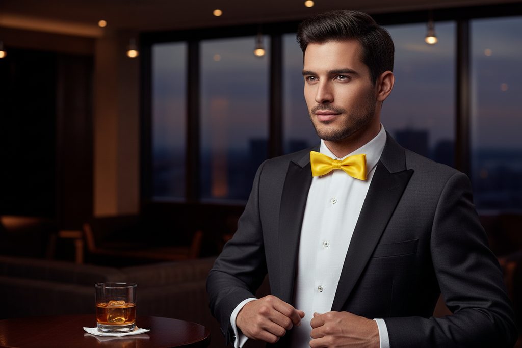 Gotowa żółta muszka błyszcząca o rozmiarze 10 cm pasuje idealnie zarówno do koszuli frakowej jak i smokingowej. Z tyłu muszki jest umieszczony haczyk z oczkiem, co umożliwia proste dopasowanie długości do obwodu Twojej szyi.