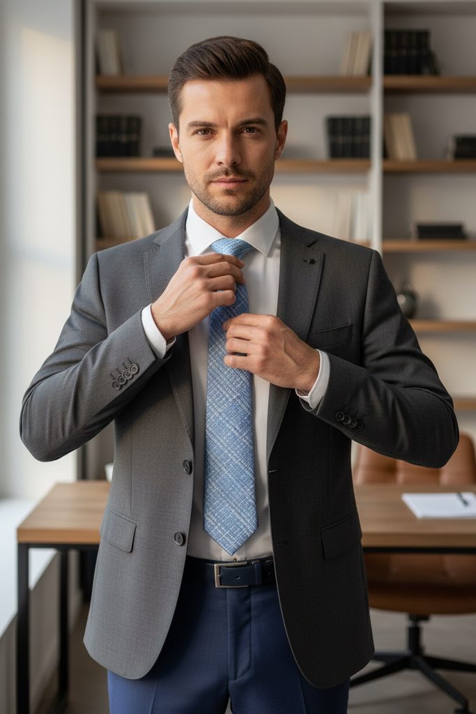 Jasnoniebieski krawat z tkanym wzorem szerokość 7,5 cm jest łatwy w pielęgnacji. Poliester na ogół ma niską zwilżalność, co oznacza, że szybko schnie, jeśli zmoknie. W porównaniu do krawatów wykonanych z jedwabiu, poliestrowe krawaty mają mniejszy połysk.