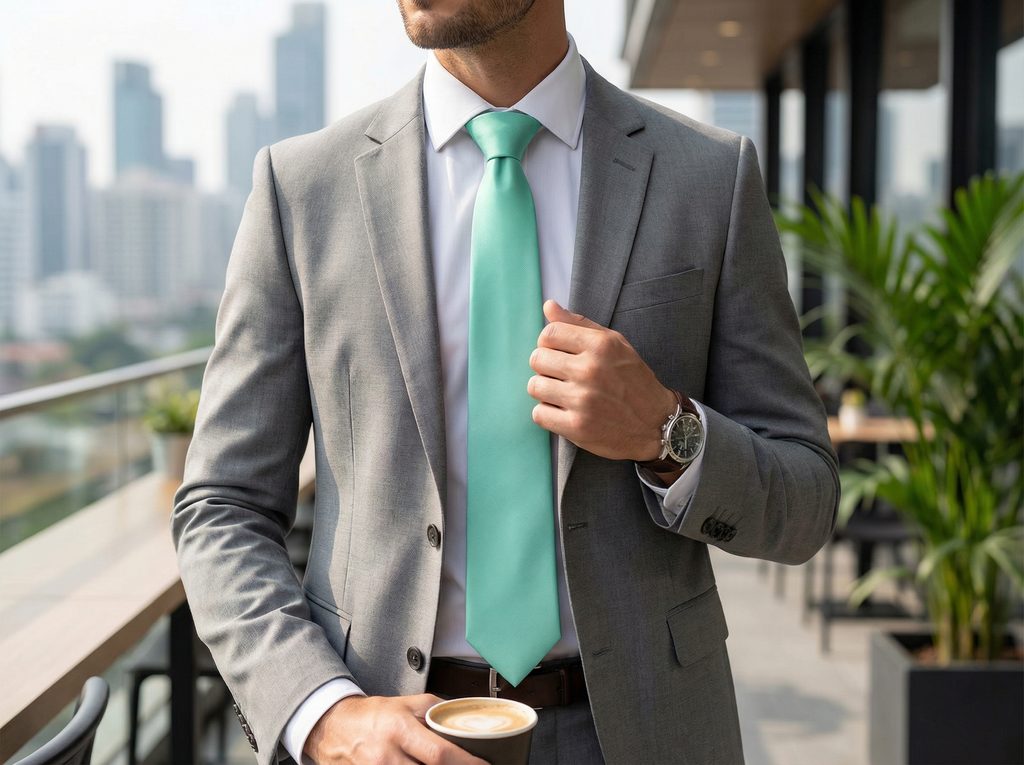 Krawat, miętowy mat szerokość 7 cm jest łatwy w pielęgnacji. Poliester na ogół ma niską zwilżalność, co oznacza, że szybko schnie, jeśli zmoknie. W porównaniu do krawatów wykonanych z jedwabiu, poliestrowe krawaty mają mniejszy połysk.