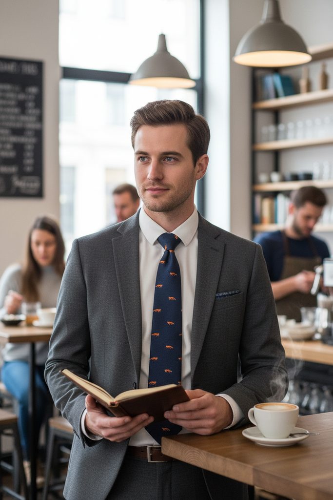 Niebieski strukturalny krawat z wędrującym pomarańczowym lisem jest jednocześnie zabawny i elegancki. Krawat jest wykonany z poliestru, a jego szerokość wynosi 7 cm.