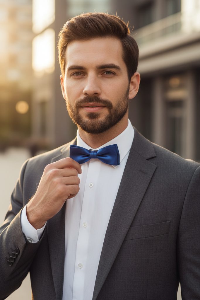 Muszka męska w kolorze granatowym o rozmiarze 10 cm pasuje idealnie zarówno do koszuli frakowej jak i smokingowej. Z tyłu muszki jest umieszczony haczyk z oczkiem, co umożliwia proste dopasowanie długości do obwodu Twojej szyi.