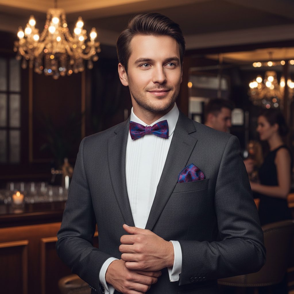 Muszka z poszetką, niebiesko-czerwony wzór o rozmiarze 12,5 cm pasuje idealnie zarówno do koszuli frakowej jak i smokingowej. Z tyłu muszki jest umieszczony haczyk z oczkiem, co umożliwia proste dopasowanie długości do obwodu Twojej szyi.