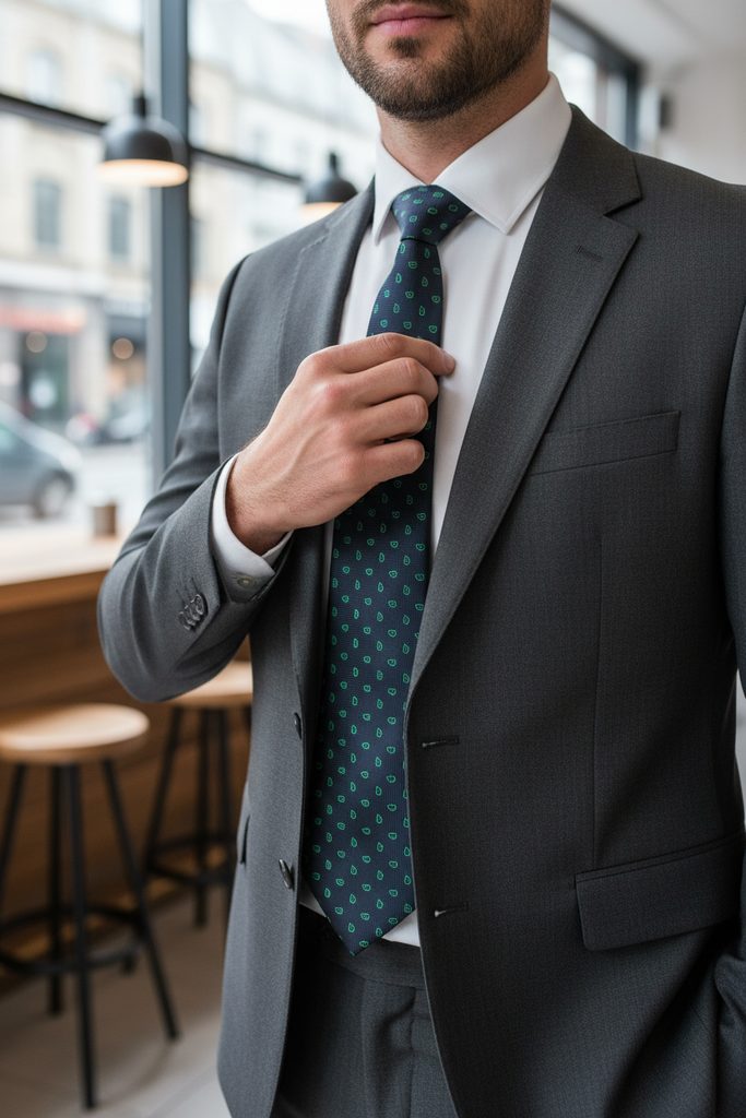 Nowoczesny krawat dla stylowych mężczyzn. Niebiesko-zielone krople są rozrzucone na niebieskim teksturowanym tle. Krawat ma 7 cm szerokości i jest wykonany z wysokiej jakości poliestru.