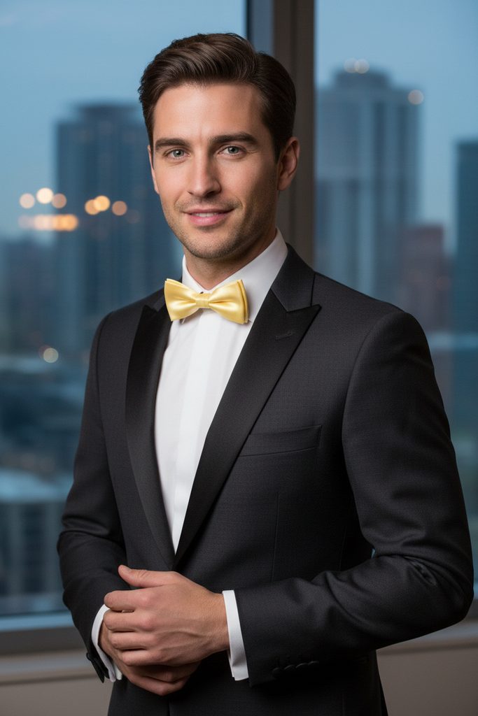 Żółta gładka muszka o rozmiarze 12,5 cm pasuje idealnie zarówno do koszuli frakowej jak i smokingowej. Z tyłu muszki jest umieszczony haczyk z oczkiem, co umożliwia proste dopasowanie długości do obwodu Twojej szyi.