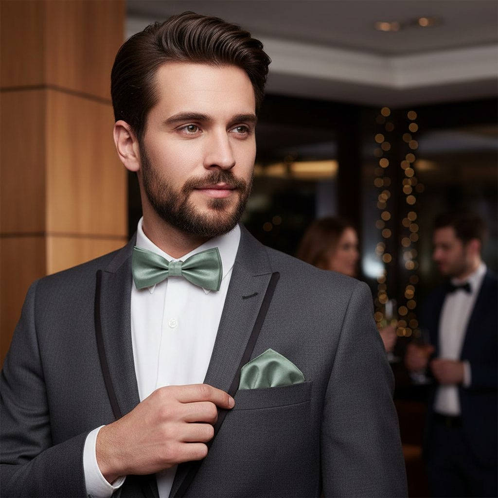 Zielona muszka z eukaliptusową poszetką o rozmiarze 12,5 cm pasuje idealnie zarówno do koszuli frakowej jak i smokingowej. Z tyłu muszki jest umieszczony haczyk z oczkiem, co umożliwia proste dopasowanie długości do obwodu Twojej szyi.